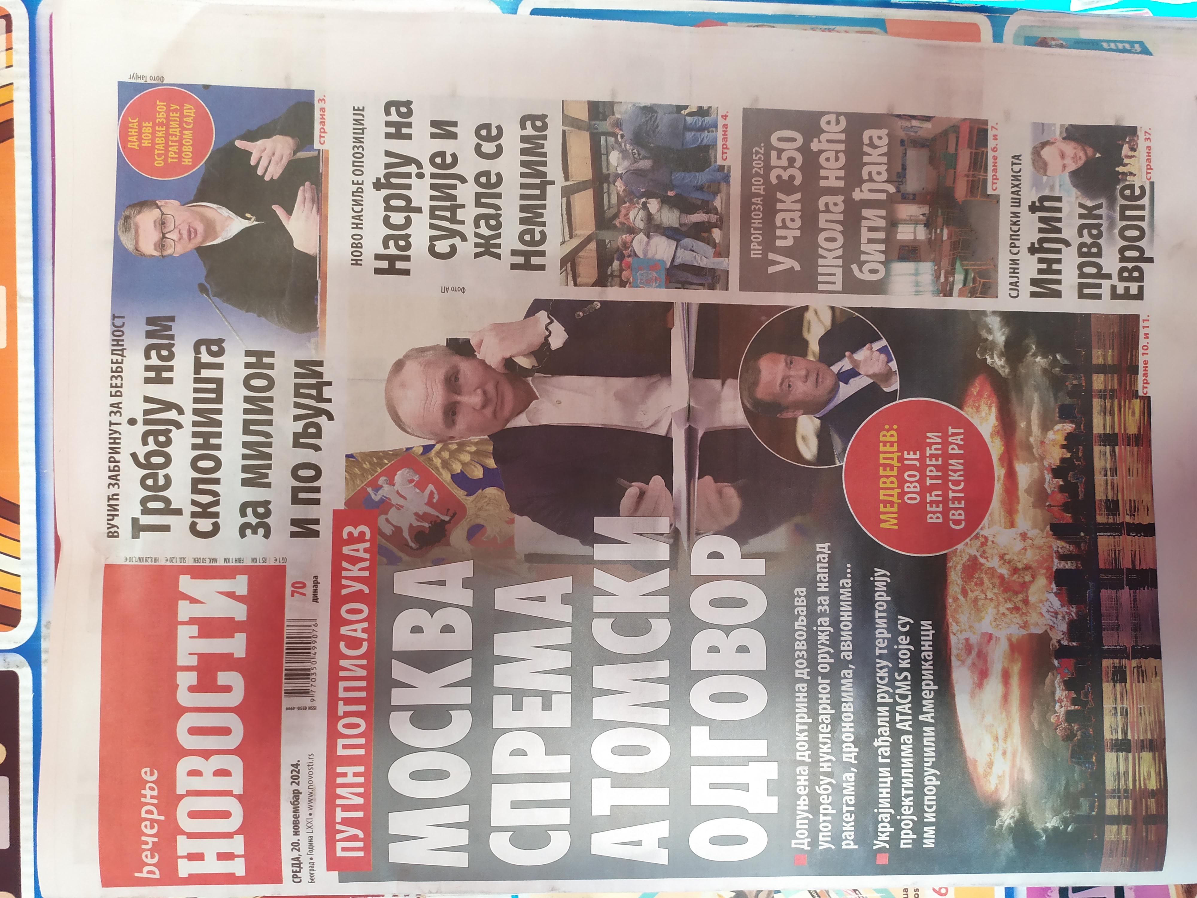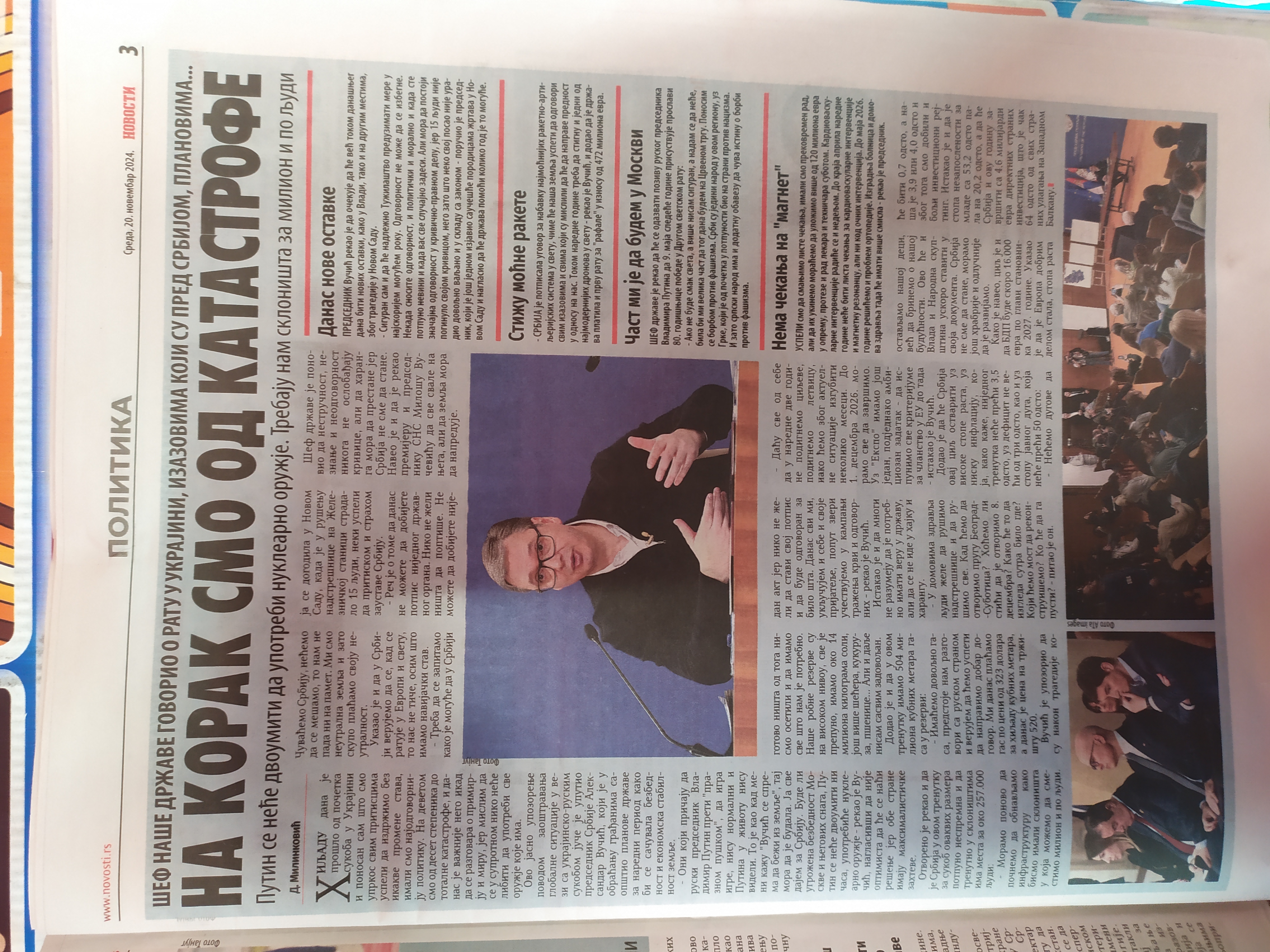 Zlatko Čobović, član Komisije za žalbe, podneo je žalbu zbog teksta koji je na naslovnoj strani lista najavljen pod naslovom „Trebaju nam skloništa za million i po ljudi”, a kojim su, po njegovoj oceni, prekršene odredbe Kodeksa koje se odnose na to da novinari svoju odgovornost javnosti ne smeju da podrede interesima drugih, posebno ne interesima državnih organa, da ne smeju da podstiču strahove, niti da slepo veruju izvoru, koji može da sledi svoje interese i prilagođavaju iskaze tim interesima. U tekstu je citirano izlaganje predsednika Srbije Aleksandra Vučića, 20. novembra 2024. godine, čiji delovi glase: „Na devetom smo od deset stepenika do totalne katastrofe......”Srbija je u ovom trenutku za sukob ovakvih razmera potpuno nespremna, trenutno u skloništima ima mesta za 257.000 ljudi…”, ...”moramo ponovo da počnemo da obnavljamo infrastrukturu kako bismo imali skloništa u koja možemo da smestimo milion i po ljudi”... Podnosilac žalbe je naveo da medij ne sme stavove političara bezrezervno da prenosi kao apsolutnu istinu, te da je list, bez napomene, ograde ili rezerve, preneo delove izjave Aleksandra Vučića, kojima on svesno i ciljano podstiče strah i širi psihozu straha, što nije u skladu sa Kodeksom novinara Srbije.
