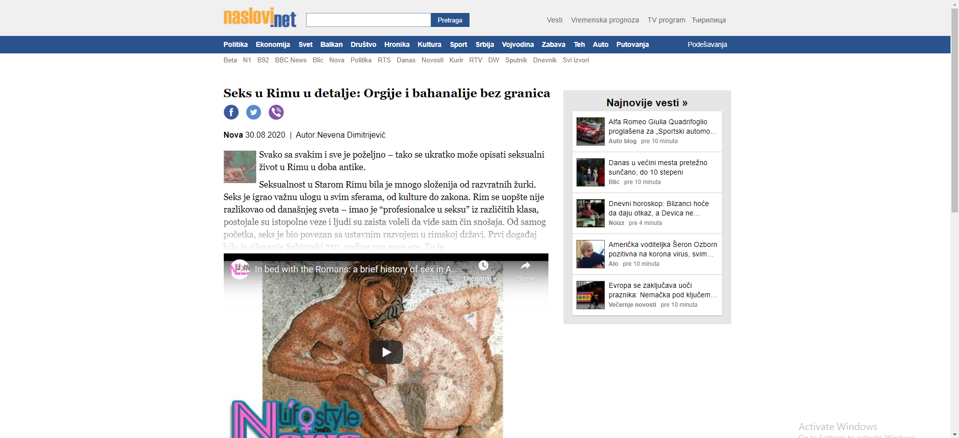 Tekstom “Seks u Rimu u detalje: Orgije i bahanalije bez granica“, objavljenim 30.avgusta 2020. godine portal „Nova.rs“ prekršio je tačke 1 i 2 Odeljka IX (Poštovanje autorstva) Kodeksa novinara Srbije, po kojima su mediji i novinari obavezni da poštuju i primenjuju važeće zakonodavstvo o zaštiti autrskih prava i da, kada dobiju dopuštenje za reprodukciju iz drugog izvora, to učine uz uvažavanje autora i uz navođenje izvora, kao i odredbu koja zabranjuje novinarima da kao svoje potpisuju tekstove, crteže, olustracije, fotografije i video zapise drugih autora.
