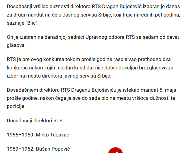 Tekstom “Dragan Bujošević izabran za DIREKTORA RTS: Drugi mandat na čelu javnog servisa“, objavljenim 2. februara 2021. godine, portal “Blic.rs” prekršio je tačke 1 i 2 Odeljka IX (Poštovanje autorstva) Kodeksa novinara Srbije, o obavezi medija i novinara da poštuju i primenjuju važeće zakonodavstvo o zaštiti autorskih prava i da, kada dobiju dopuštenje za reprodukciju iz drugog izvora, to čine, uz uvažavanje autora i uz navođenje izvora, kao i da neće, kao svoje, potpisivati tekstove, crteže, ilustracije, fotografije, video i zvučne zapise drugih autora