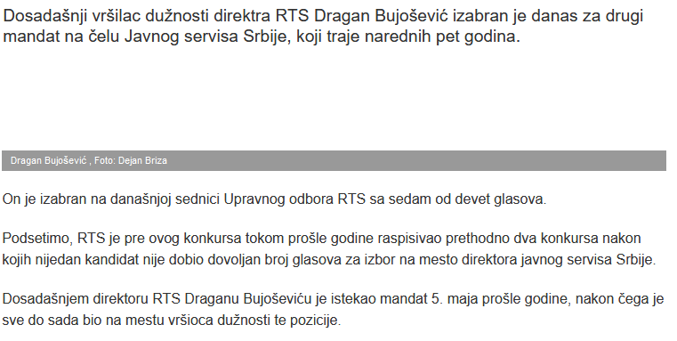 Tekstom “NA JAVNOM SERVISU SAMO REPRIZE Dragan Bujošević ponovo izabran za direktoraRTS-a!”, objavljenim 2. februara 2021. godine u onlajn izdanju, portal “Alo.rs” prekršio je tačke 1 i 2 Odeljka IX (Poštovanje autorstva) Kodeksa novinara Srbije, o obavezi medija i novinara da poštuju i primenjuju važeće zakonodavstvo o zaštiti autorskih prava i da, kada dobiju dopuštenje za reprodukciju iz drugog izvora, to čine uz uvažavanje autora i uz navođenje izvora, kao i da neće, kao svoje, potpisivati tekstove, crteže, ilustracije, fotografije, video i zvučne zapise drugih autora
