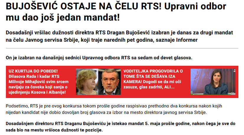 Tekstom “BUJOŠEVIĆ OSTAJE NA ČELU RTS! Upravni odbor mu dao još jedan mandat!”, objavljenim 2. februara 2021. godine u onlajn izdanju, dnevni list “Informer” prekršio je tačke 1 i 2 Odeljka IX (Poštovanje autorstva) Kodeksa novinara Srbije, o obavezi medija i novinara da poštuju i primenjuju važeće zakonodavstvo o zaštiti autorskih prava i da, kada dobiju dopuštenje za reprodukciju iz drugog izvora, to čine uz uvažavanje autora i uz navođenje izvora, kao i da neće, kao svoje, potpisivati tekstove, crteže, ilustracije, fotografije, video i zvučne zapise drugih autora