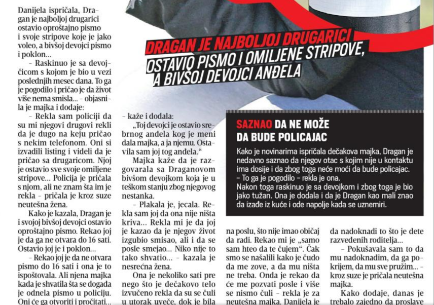 Kodeks vrlo jasno propisuje da prilikom izveštavanja o nesrećama i krivičnim delima, nije dozvoljeno objavljivanje imena i fotografija žrtava i počinilaca koje ih jasno identifikuju. Takođe, nije dozvoljeno ni objavljivanje bilo kakvih podataka koji bi indirektno mogli da otkriju identitet bilo žrtve, bilo počinioca, pre nego što nadležni organ to zvanično saopšti. Identitet preminulog dečaka je otkiven, ali i identitet članova njegove porodice, dok se posredno mogu prepoznati i devojčice koje se pominju prilikom spekulacija o motivima i sadržaju oproštajnog pisma. Time je prekršena i odredba Kodeksa koja zabranjuje iznošenje spekulacija i nedovoljno proverljivih stavova u izveštavanju o nesrećama ili tragedijama.